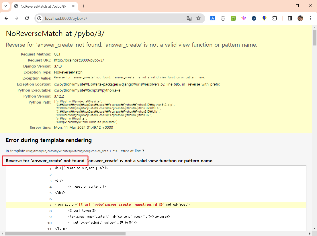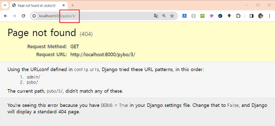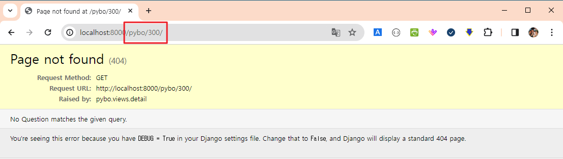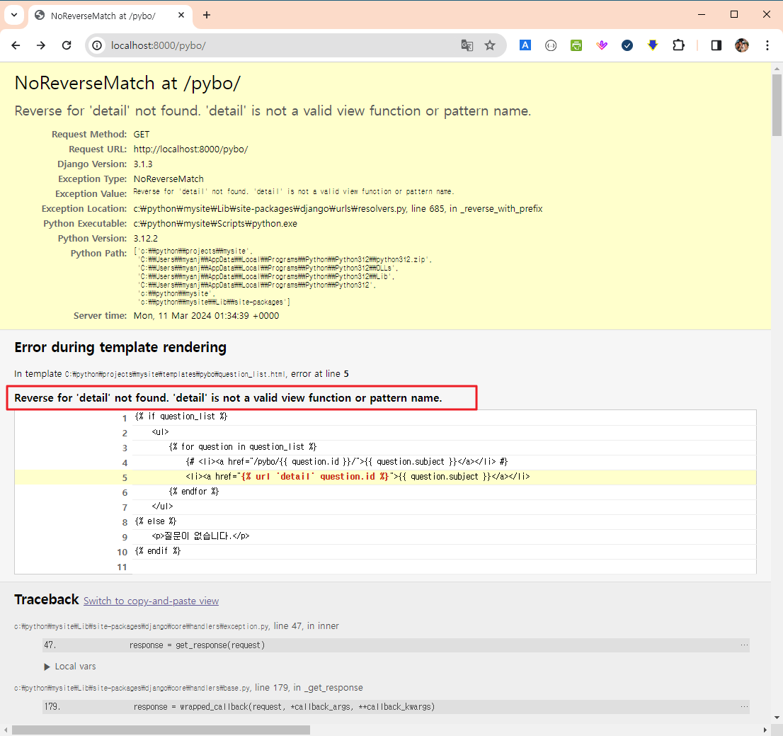 /pybo/숫자/ 형식의 URL 패턴이 정의되어 있지 않아서 질문을 클릭하면 상세 페이지로 넘어가지 못한다.