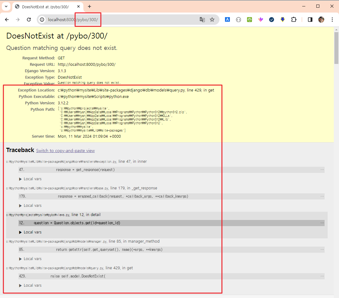 이전에 존재하지 않은 데이터를 조회했을 때는 자세한 오류 메시지가 출력 됐지만, get_object_or_404를 사용해 내부 정보가 포함되지 않는 단순한 오류 메시지가 출력되도록 수정했다.