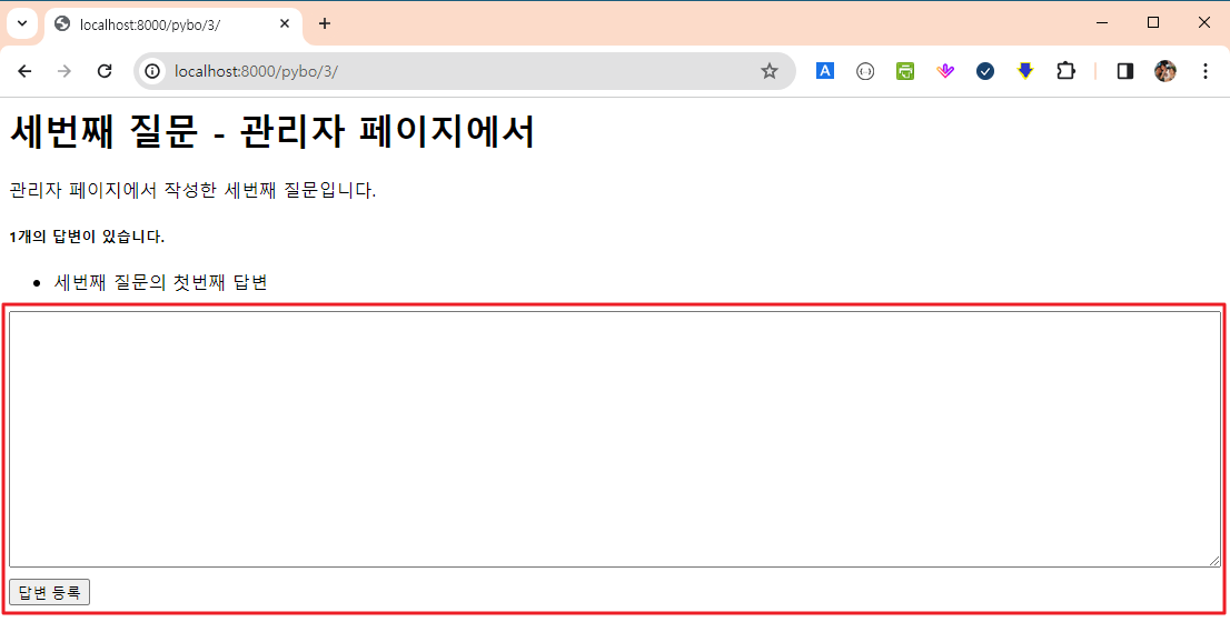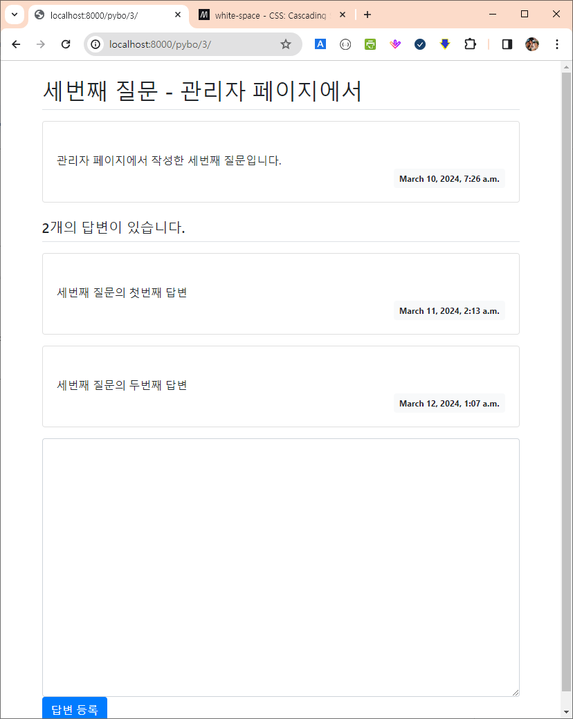 답변 내용을 입력하는 창(textarea 태그)의 넓이가 화면의 가로 100%를 차지하고 답변 등록 버튼(submit 버튼)의 위쪽 바깥 여백이 10px 추가된 것을 확인할 수 있다.