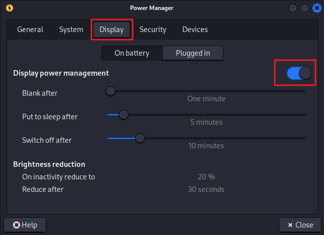 Power Manager에서 Display로 들어오면 나오는 화면인데 비활성화하고, blank after 설정이 Never가 나올 수 있도록 왼쪽 끝으로 설정하면 된다. Plugged in에서도 같은 설정을 하면 된다.