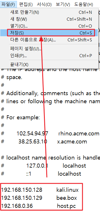 Host PC에서 cmd를 관리자 권한으로 실행 후 notepad c:\Windows\System32\drivers\etc\hosts 입력