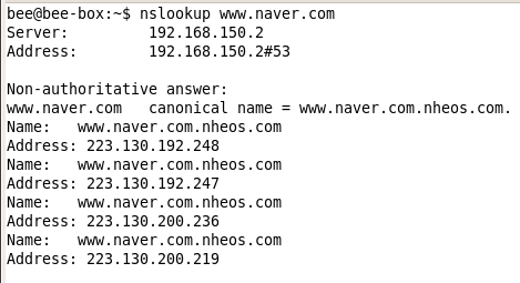 위 두 사진은 bee.box 웹 페이지에서 검색한 결과와 bee box 터미널에서 lookup 사용한 결과를 보여준다.