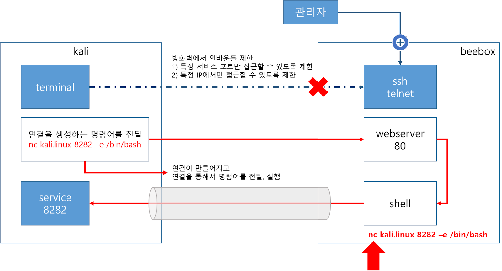 kali에서 연결을 생성하는 명령어를 웹 서버에 전달하면 웹 서버는 쉘 명령어로 인식하고 쉘 명령어를 실행해 쉘은 8282 서버에 연결해 주는 것이다. 그러면 내부에서 내부로 나가게 되는 것이다.