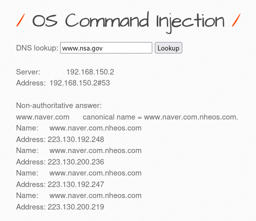 두 내용을 비교해 보면 동일한 내용이 출력되는 것을 확인할 수 있다. 즉, 웹 페이지에서 사용자 입력한 값이 서버 내부에서 운영체제 명령어 실행에 사용되는 것을 추측할 수 있다.