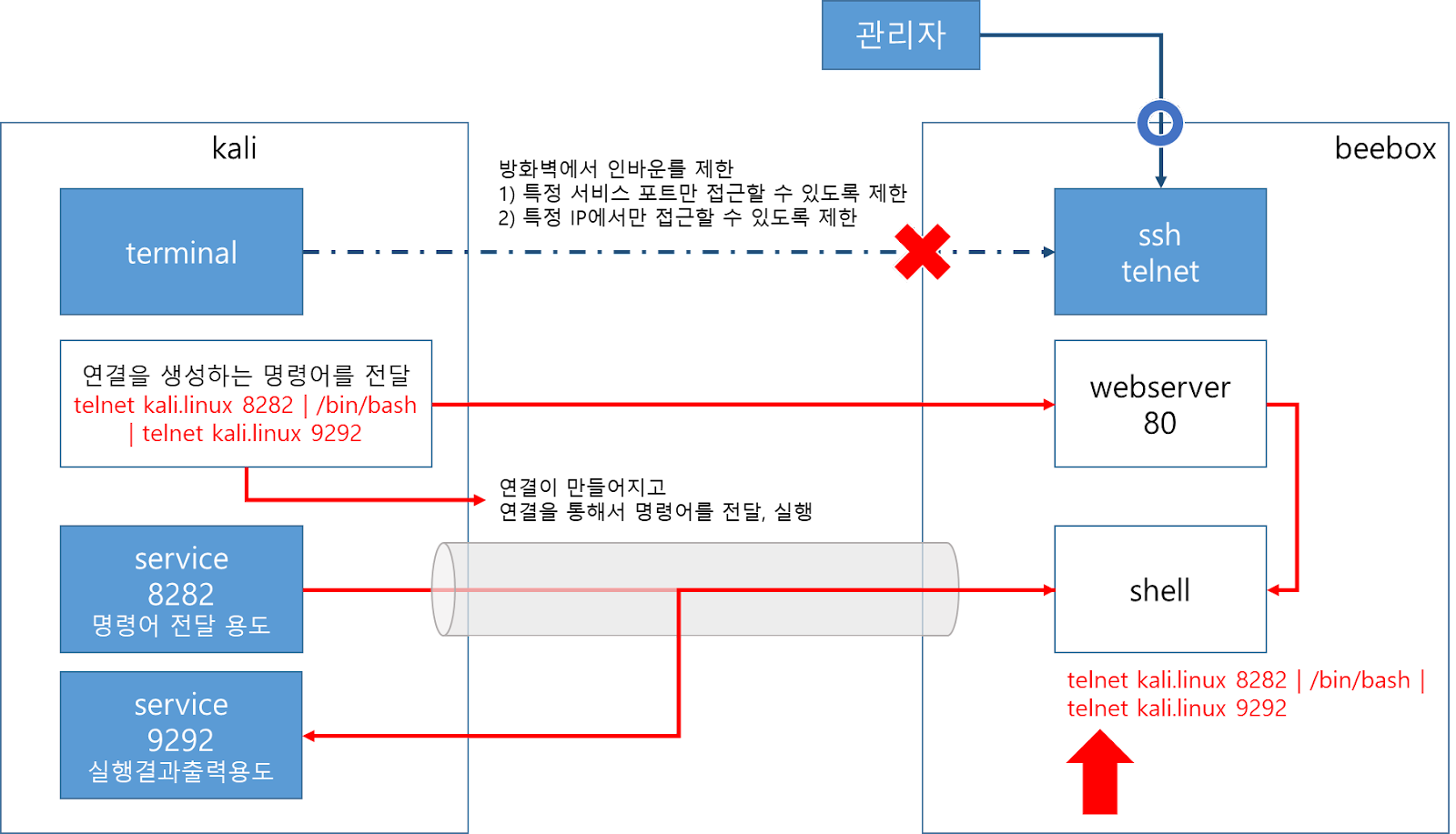 kali가 bee box 서버 내부의 쉘 명령어를 사용하기 위해서는 ssh나 telnet으로 접속해서 쉘 명령어를 사용해야 하지만, 알 수 없는 곳으로부터 오는 것은 일반적으로는 보안 정책상 제공하지 않는다. 지정해 놓은 관리자가 있다면 관리자가 위치한 곳에서의 접속은 허용한다.