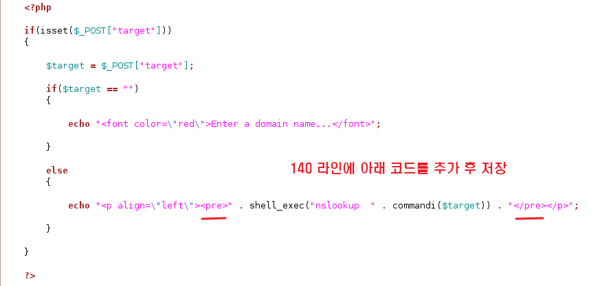 들어가면 DNS lookup이 보이는데, 검색하면 알아보기 힘들게 출력된다. 이 문제를 해결하기 위해 bee box 가상머신에서 commandi.php 파일을 수정해야 한다. 관리자 권한 실행인 sudo로 열어야 저장된다.