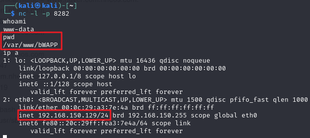 kali에서 명령어를 실행하고 있지만, pwd 명령어와 ip를 보면 bee box의 위치와 ip가 나오는 것을 확인할 수 있다.