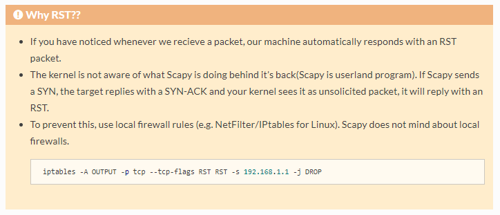 일반적인 프로그램들은 운영체제를 통해서 패킷이 나가는데 스카피는 자기가 그냥 전송하는 것이다. 갑자기 bee.box서버에서 SYN-ACK가 들어오는 것이다. 갑자기 알 수 없'는 SYN-ACK가 들어오니까 kali에서 리셋 시키는 것이다.