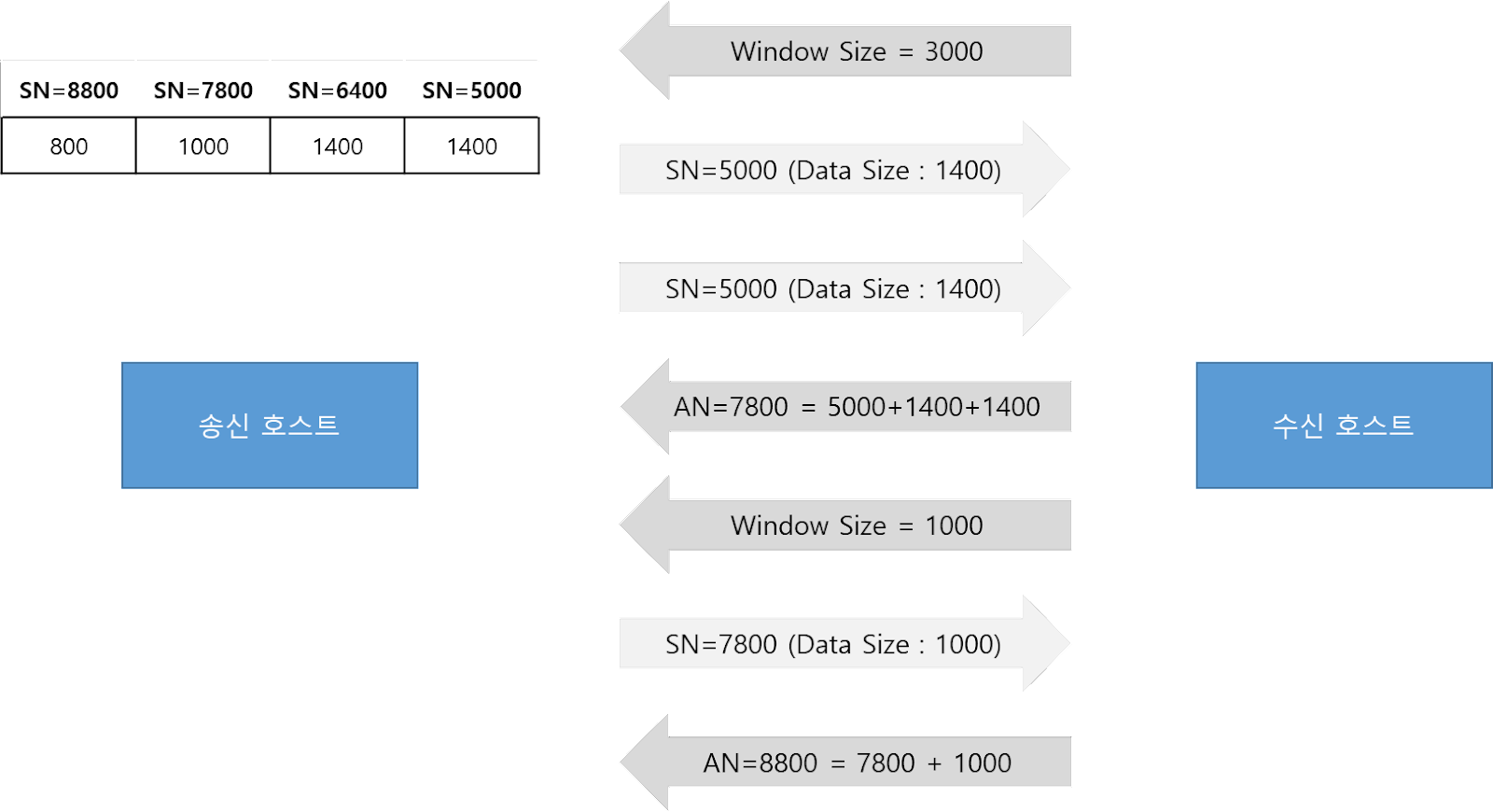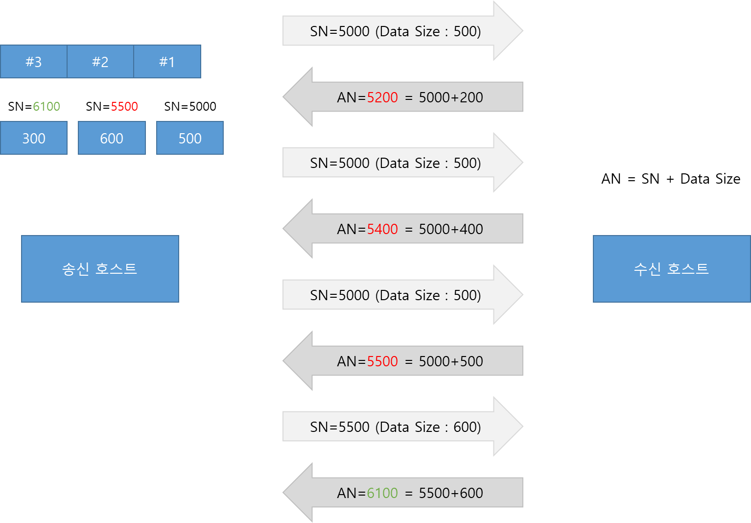 SN과 Data Size를 합쳐서 5500을 보냈는데 AN으로 5200이 오면 불일치가 되어 처음 보냈던 트래픽을 다시 보내는데 SN과 Data Size의 합과 AN이 같을 때까지 다시 전송한다.