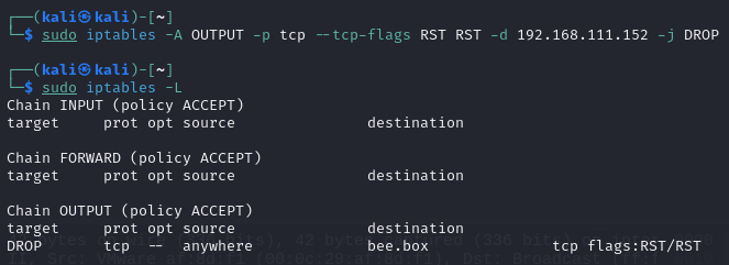 그것 때문에 운영체제가 보내는 리셋이 섞여서 나온다. 이런식으로 리셋이 나오면 bee.box 서버에서는 재연결을 시도한다. 그러면 패킷 분석이 어려워지기 때문에 iptables과 갈은 방화벽에 리셋 패킷이 나가는 것을 막는다.