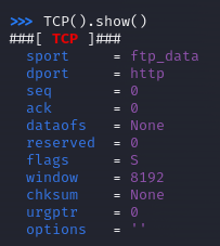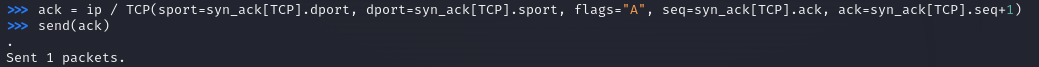 ack = ip / TCP(sport=syn_ack[TCP].dport, dport=syn_ack[TCP].sport, flags="A", seq=syn_ack[TCP].ack, ack=syn_ack[TCP].seq+1)