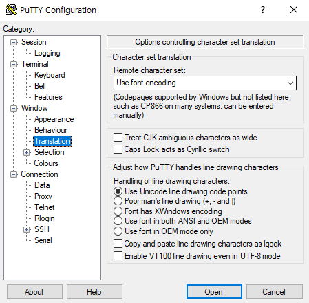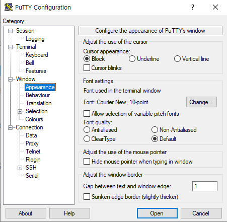 설정을 저장하고 싶으면 'Saved Sessions'에 저장할 이름을 적고 'Save'를 클릭하면 되는데 SSH 접속 후 폰트가 깨질 가능성이 크다. 폰트가 깨졌을 때는 설정을 해주면 된다.