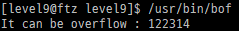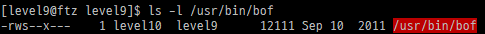 "/usr/bin/bof"를 이용해 level 10의 권한을 얻어야 한다. 일단 실행시켜보고 시작하자.