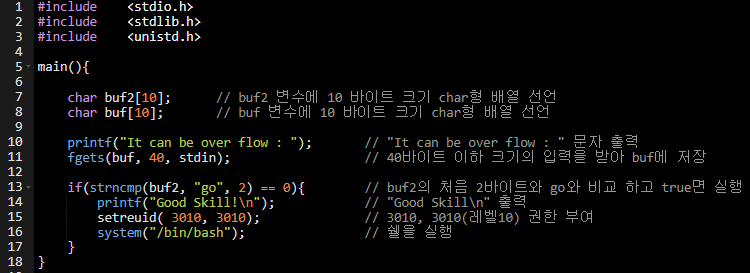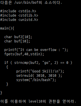 이때 우리는 bof를 일으켜 buf2에 go를 입력해야 한다.