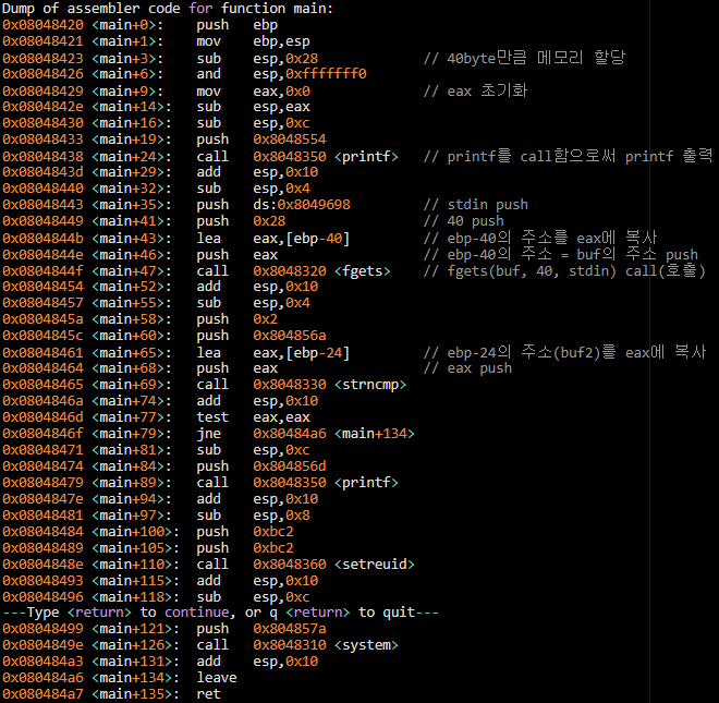 disassemble (disas, disass, disasse.... ):: 프로그램의 어셈블리 코드 보는 명령어