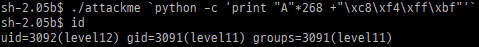 realaddr 주소로 attackme에 BOF를 하면 오류가 나지 않고 level 12의 권한을 얻을 수 있다.