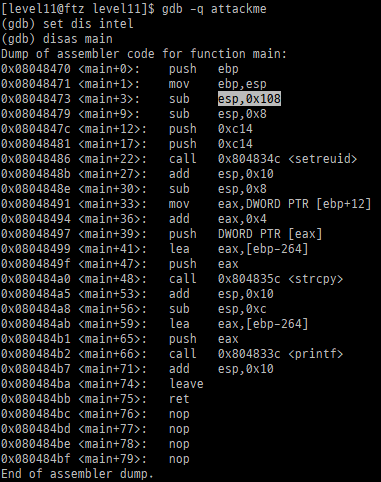 16진수 0x108, 10진수로는 264다. 이것은 str 256byte에 dummy 8byte가 끼어 있는 것이고 SFP의 크기인 4byte를 더하면 268byte가 되므로 "A"*268을 한다. 그러면 RET부분에 쉘 코드 주소가 덮어 써지게 된다.