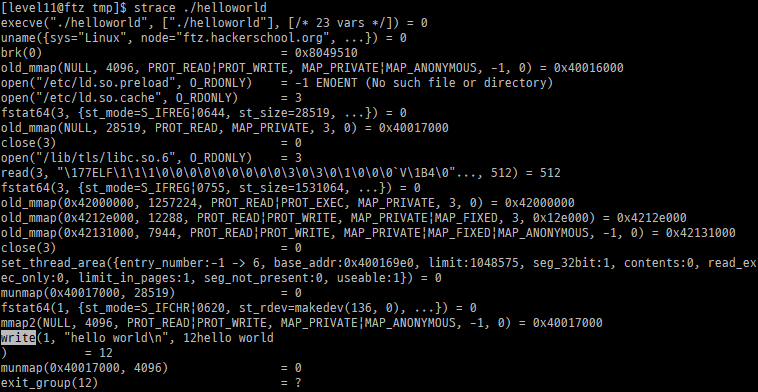 strace로 helloworld의 system call을 추적해 어떤 system call을 사용하는지 알아본다.
