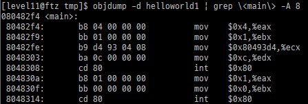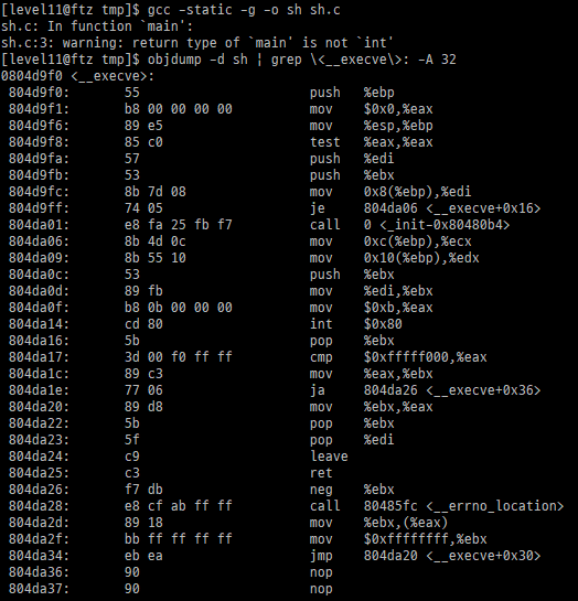 여기서 컴파일할 때 그냥 컴파일하면 objdump가 실행되지 않는다. execve() 함수 때문에 이 프로그램은 컴파일되면서 Linux libc와 링크되게 된다. execve()의 실제 코드는 libc에 들어 있기 때문이다. 따라서 execve()가 어떤 일을 하는지도 알아보기 위해 static library 옵션을 주어 컴파일해야 한다.