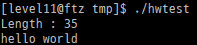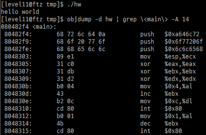 컴파일 후 실행하면 "hello world" 잘 나오고 objdump 실행하여 기계어를 보면 "\x00"인 NULL이 사라진 걸 볼 수 있다.