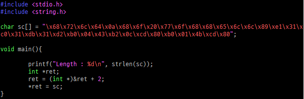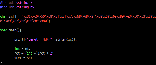 하지만 이 코드는 NULL 바이트 때문에 공격에 사용할 수 없다. 버퍼 오버플로나 포맷 스트링 버그는 문자열 함수의 취약점을 이용한 공격인데 문자열 함수는 NULL 바이트를 만나면 문자열이 끝났다고 인생하고 입력을 NULL 바이트까지만 받는다.