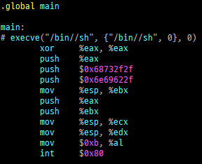 xor %eax, %eax // 기계어에서 \x00에 해당하는 NULL 지우기 위해 사용한다.