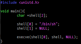 위 조건들을 만족하게 해 주기 위해 char *shell[2]를 만들고 각 인자를 채워준다. 두 번째 인자인 인자들의 포인터는 C 프로그램의 main() 함수에 argv 인자를 떠올리면 된다. argv[0]은 해당 프로그램의 실행 파일 이름을 나타내고 argv[1]은 실행 시 주어진 첫 번째 인자... 이런 식으로 나간다. 마찬가지로 execve()의 두 번째 인자는 argv[0]부터 들어가는 값을 가리키는 포인터가 되어야 한다.