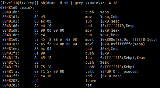 "push $0x0" NULL을 push하고 "lea 0xfffffff8(%ebp), %eax", "puush %eax" ebp +8의 주소를 eax 레지스터에 넣은 다음에 eax 레지스터를 push 한다. 포인터를 push한 것이다. "pushl 0xfffffff8(%ebp)", "call 804d9f0<__execve>" ebp +8의 값을 push하고 execve()를 호출한다.