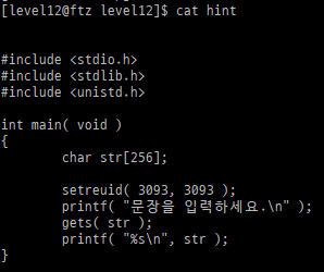 level 12는 level 11과 비슷하지만 여기서는 gets 함수가 나왔다.
