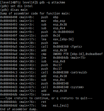 그다음 main+29에서 문자열을 비교한다. check 변수는 ebp-16에 저장되어 있고 지금까지 나온 건 ebp-36이다. 이로써 buf와 chack 사이에 dummy 값 20byte가 들어 있는 걸 확인할 수 있다.