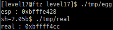 이렇게 되면 level 16처럼 shell 함수의 주소도 없고 level 14처럼 글자를 대조하는 것도 아니고 level 15처럼 주소를 넣는 것도 할 수 없다.