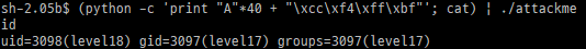 여기서 해야 하는 건 setreuid가 실행되고 쉘을 실행해야 level 18의 uid를 얻을 수 있다는 것이다.