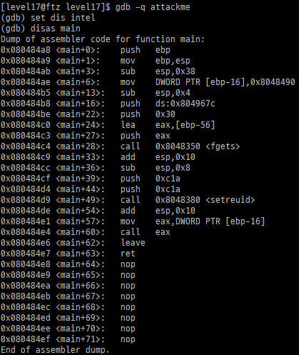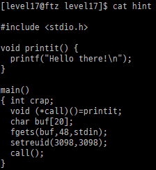 level 16 hint 코드에서 shell 함수가 빠지고 setreuid는 main으로 들어오게 됐다.