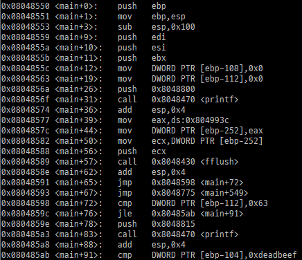 main+91에서 0xdeadbeef와 비교하는 거로 봐서는 check의 주소가 "ebp-104"라는 걸 알 수 있다.