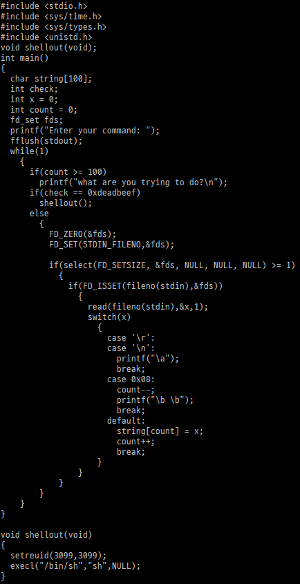 위와 같이 생각하고 코드를 보게 되면 변수들이 선언되고 변수 check 값이 0xdeadbeef면 shellout 함수가 실행되는 아주 간단한 코드가 된다.