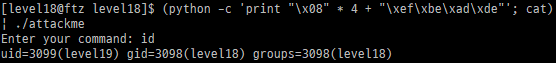 "0xdeadbeef"가 들어갈 때까지 루프가 실행되고 "0xdeadbeef"가 다 들어가게 되면 다음 루프가 실행할 때 두 번째 if 문에서 check와 비교하게 되어 쉘이 실행되는 것이다.