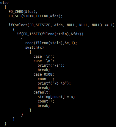 그렇게 되면 세 번째 case인 0x08에 걸려 "count--;"가 되고 "count = -1;"이 되어 다시 while 루프가 실행된다.