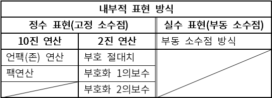 - 음수의 경우 정수 부분 : 부호와 절댓값의 표현법 1의 보수법이나 2의 보수법 중 하나를 사용하는데 보통 2의 보수법을 많이 사용