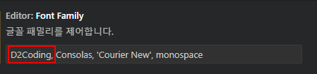 이곳 제일 앞에 D2Coding을 적어주면 글꼴 설정은 끝난다.