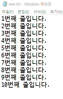 - 쓰기 모드는 파일이 없으면 새로 만들고 파일이 있으면 덮어쓰기 한다.