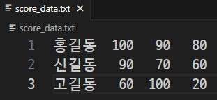 성적 데이터 파일을 읽기 위해서는 성적 데이터 파일이 있어야 하기 때문에 score_data.txt 파일에 이름과 성적을 적어 성적 데이터를 만들어 준다.