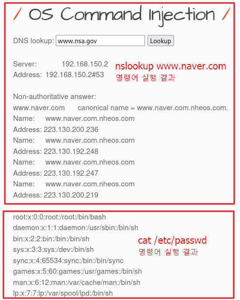 두 내용을 비교해 보면 동일한 내용이 출력되는 것을 확인할 수 있다. 즉, 웹 페이지에서 사용자 입력한 값이 서버 내부에서 운영체제 명령어 실행에 사용되는 것을 추측할 수 있다.