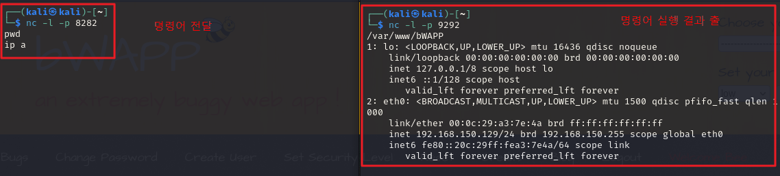 kali에서 명령어를 실행하고 있지만, pwd 명령어와 ip를 보면 bee box의 위치와 ip가 나오는 것을 확인할 수 있다.